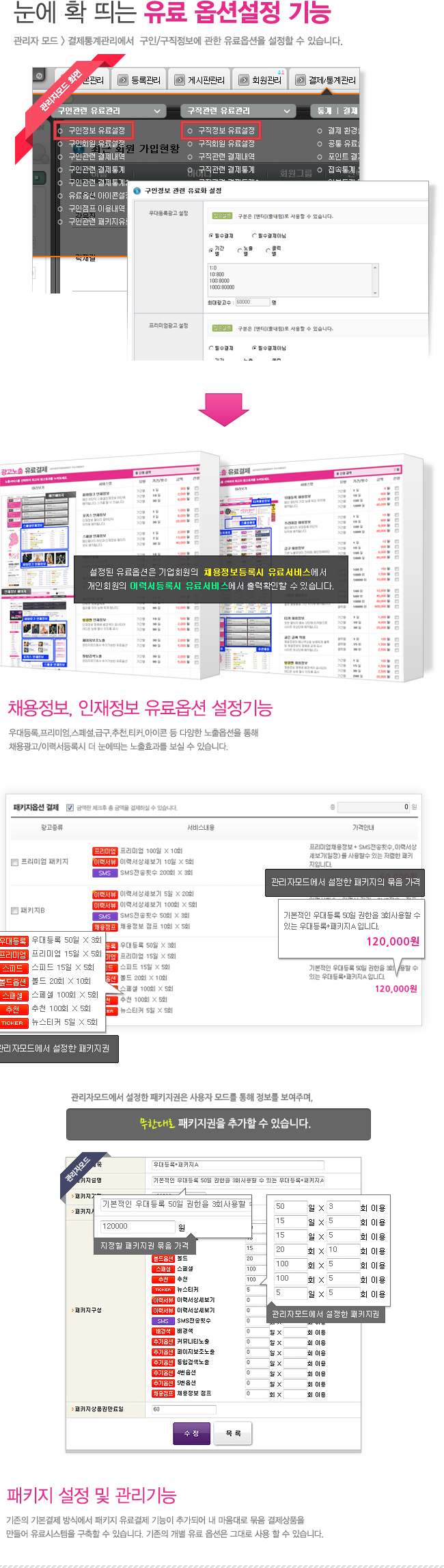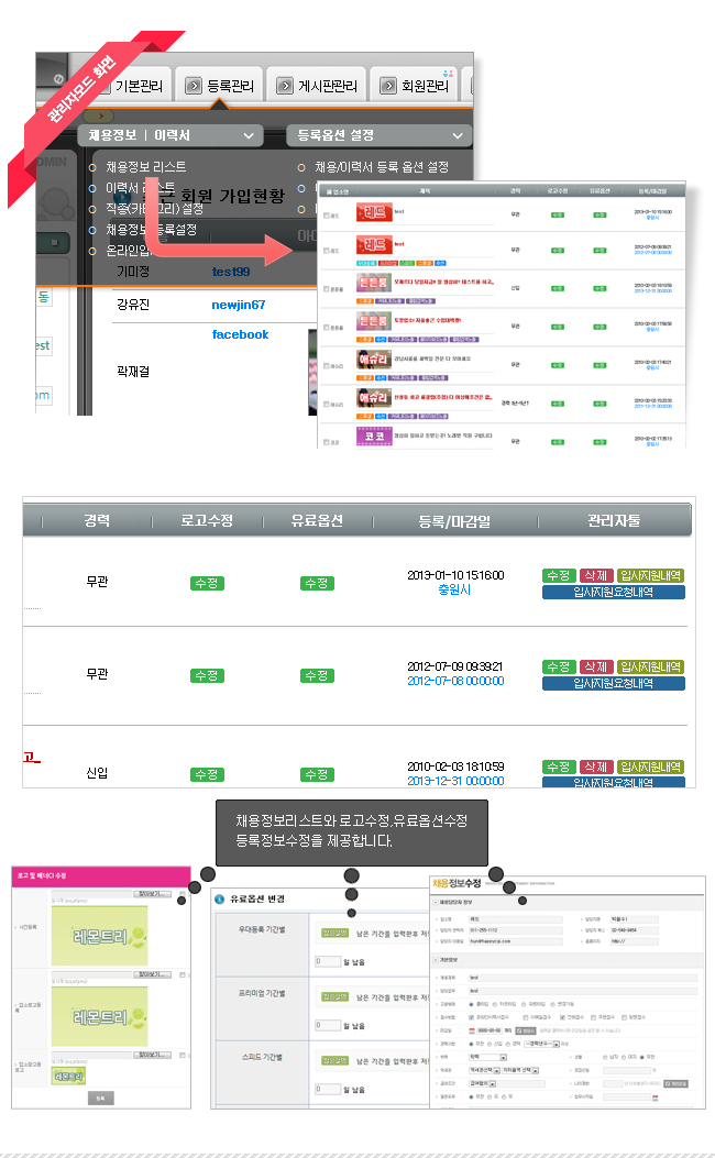 관리자는 회원·공고·이력서·유료 서비스를 통합 관리하며