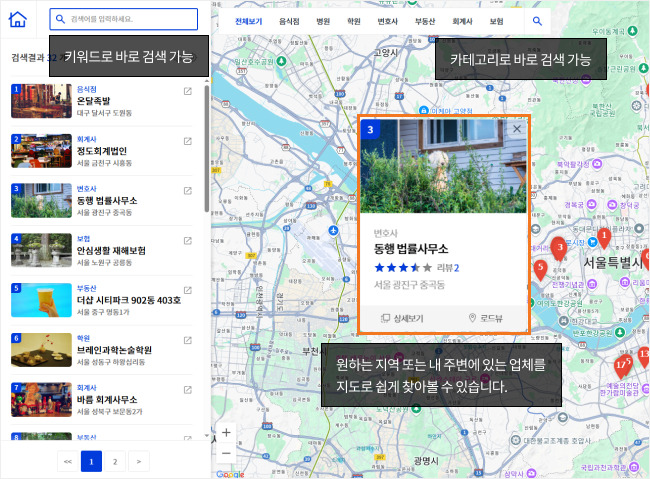 사용자가 카테고리와 지역별 검색으로 원하는 업체를 찾아볼 수 있는