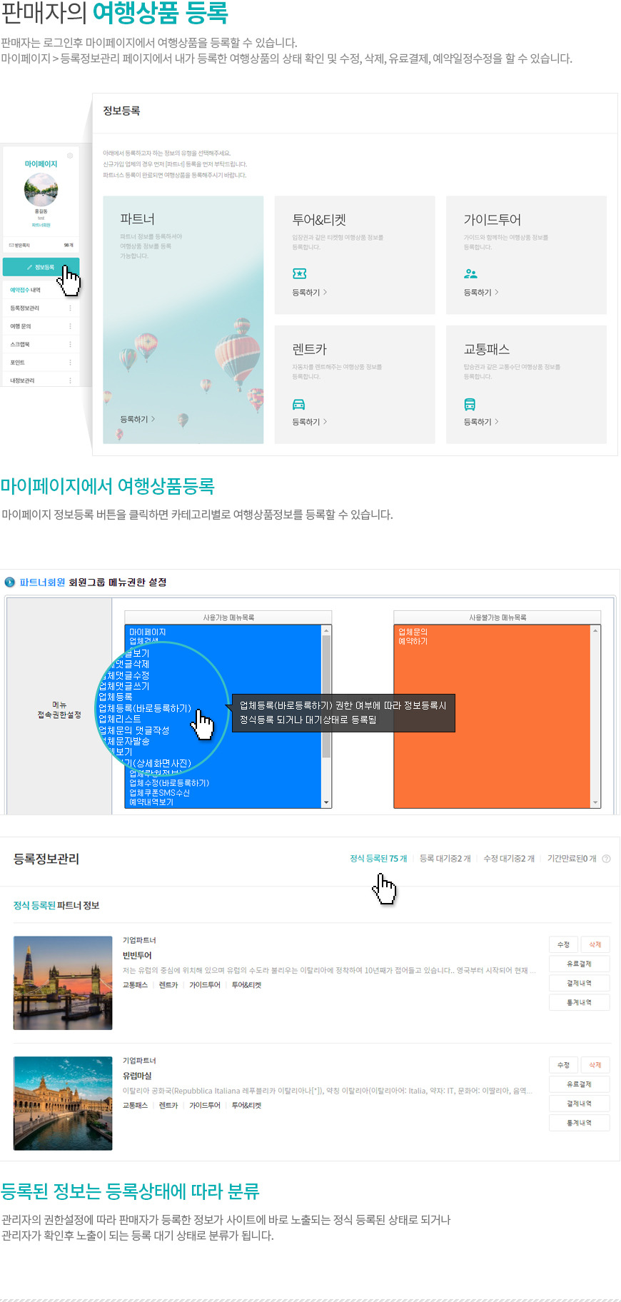 회원(여행사)이 여행상품을 직접 등록하고 관리할 수 있으며,