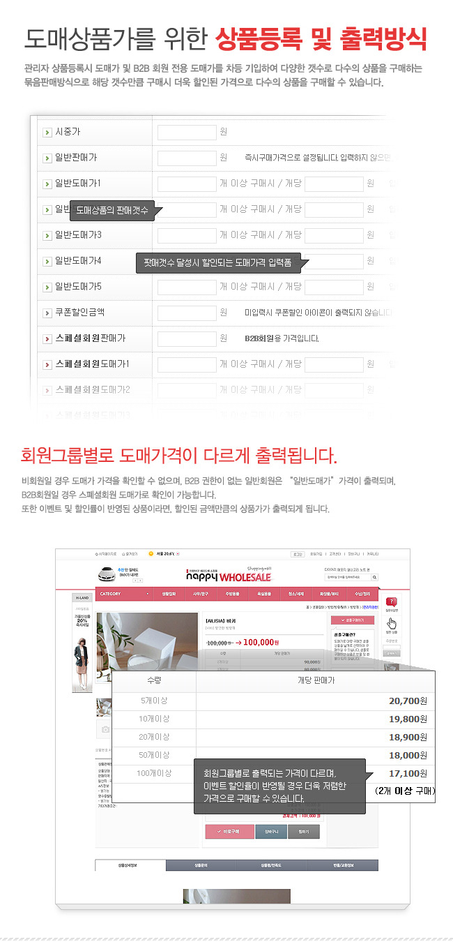 상품 등록, 회원등급별 가격 정책, 대량주문, 흥정기능까지 지원하는