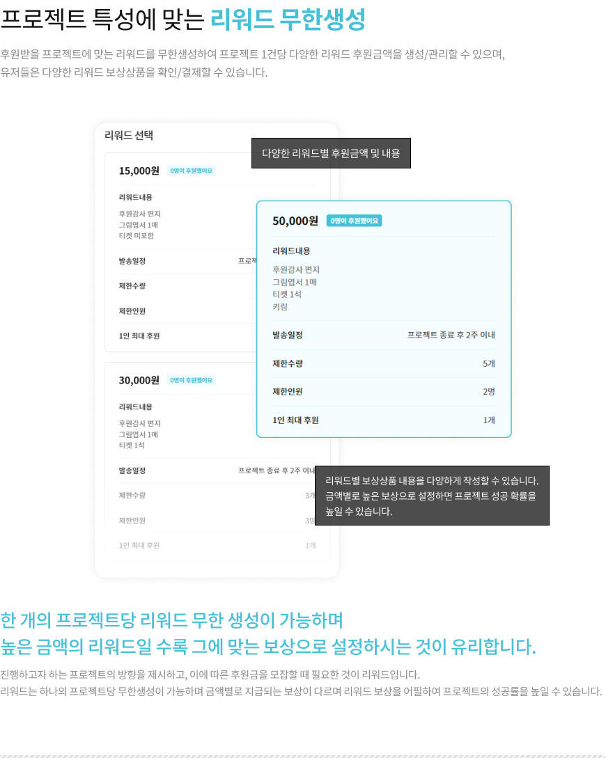 ✔ 리워드형 후원 시스템 → 하나의 프로젝트에 다양한 리워드 지정 가능