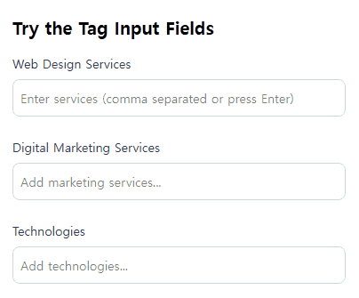 TailwindCSS 태그 입력 시스템은 표준 입력 필드를 부드러운 애니메이션과 TailwindCSS 스타일을 적용한 대화형 태그 입력으로 변환하는 가벼운 jQuery 플러그인입니다.