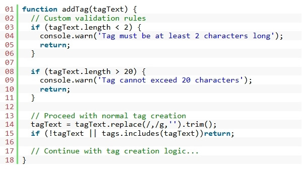 7. 다음 addTag 함수를 사용하여 사용자 정의 검증을 추가합니다.