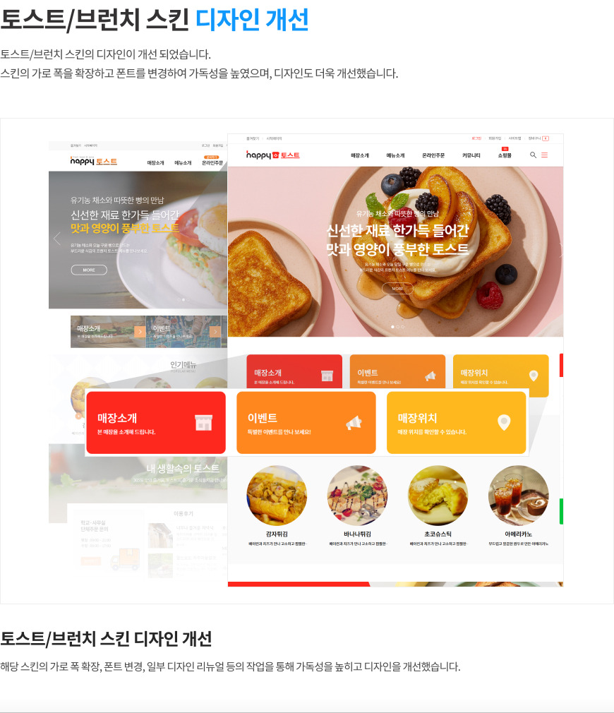 간편 홈페이지 회사소개02, 토스트/브런치, 요가, 홈케어 스킨이 새롭게 리뉴얼 되었습니다.