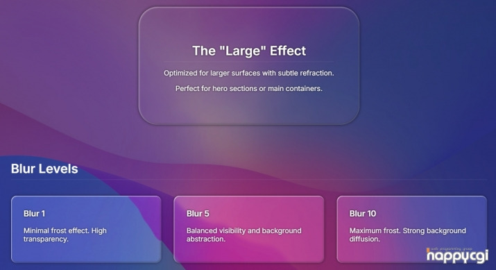 - 유틸리티 클래스 API : .liquidGlass, .liquidGlassLarge, .liquidBtn, 및 와 같은 클래스를 사용하여 효과를 적용합니다 .blur-[0-10].