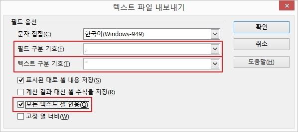 넣어주시면 되시며 "모든 텍스트 셀 인용"에 체크를 해주시면 됩니다.