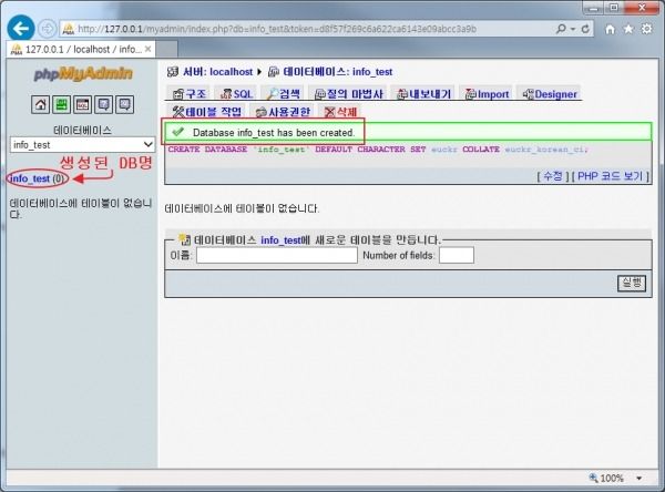 접속하신 후 상단의 데이터베이스로 이동을 하시면 하단에 새 데이터베이스 만들기 부분이 있습니다.