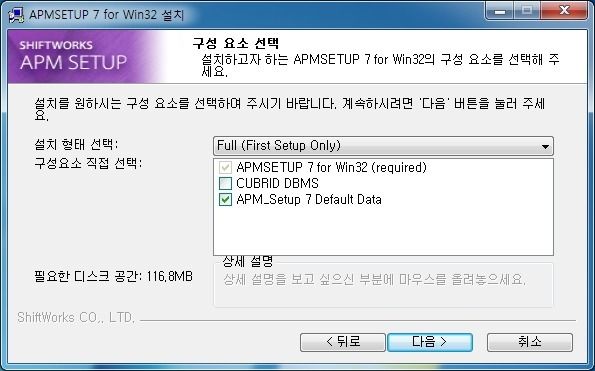 구성요소 선택 부분에서 "CUBRID DBMS" 부분은 데이터베이스를 CUBRID 용으로 설치를 위한 것으로