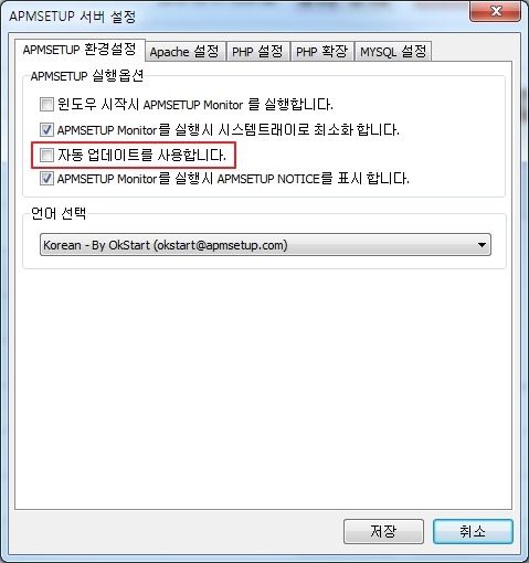 APMSETUP 환경 설정에서 "자동 업데이트를 사용합니다." 에 체크를 해제해 주시면 됩니다.