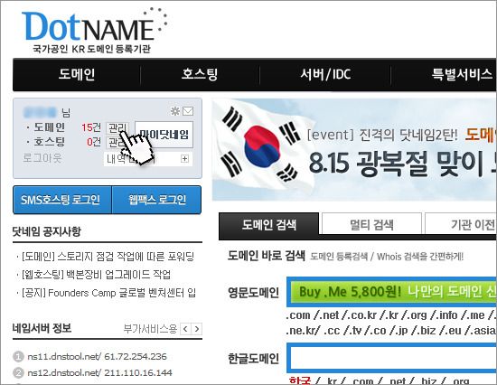 1. 국내대표 도메인판매처인 http://www.dotname.co.kr/ (닷네임코리아)에 접속을 합니다.