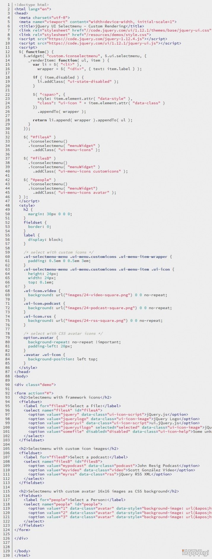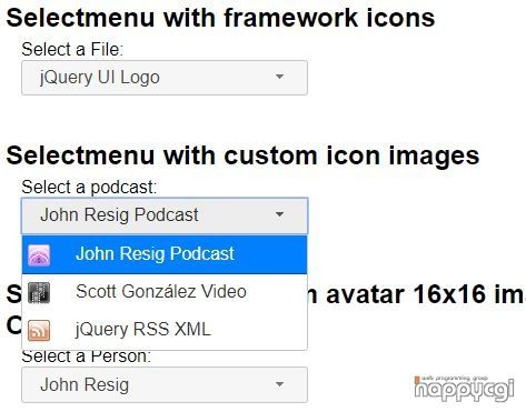 웹프로그램밍 자료실/JAVA 자료 [해피CGI][cgimall] jQuery UI Selectmenu 해피CGI윤실장 2019. 2. 14. 08:59 위와 같이 셀렉트 박스에 이미지 아이콘 등을 넣을수 있습니다. 소스는 첨부 파일의 소스를 참고하시면 됩니다. 저작자표시 (새창열림)
