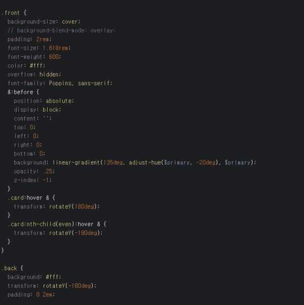 웹프로그램밍 자료실/기타 자료 [해피CGI][cgimall] css로 마우스 오버시 뒤집히는 카드 Card Flip 해피CGI윤실장 2020. 5. 11. 09:17 마우스 오버시 카드가 뒤집히면서 다른 정보를 보여줄 수 있습니다.css 만으로 구현이 가능합니다. 저작자표시 (새창열림)