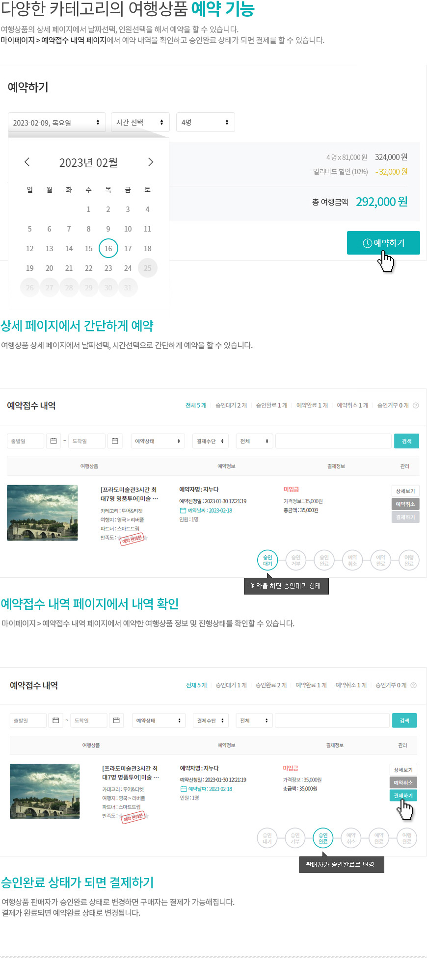 또한 일정표, 상세설명, 사진, 후기 기능을 통해 신뢰성 있는 상품 정보를 제공하며,