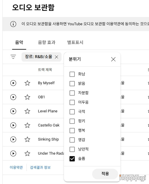 다양한 필터링 기능을 통해서 원하는 분위기의 음원을 쉽게 찾을수도 있습니다.