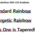 그라디언트 css를 이용하셔 다양한 underline 스타일을 만들어 볼 수 있습니다. 사이트에 가보시면 12종의 underline을 확인 하실 수 있으며 소스를 수정하여 다양하게 응용하여 사용하실 수 있습니다. 밑줄과 사용된 css는 아래와 같습니다. 1. Standard Rainbow 2. Energetic Rainbow 3. This One is Tapered! 4. This One Grows! 5. Double Underline 6. Rare Triple Underline 7. Graph Paper 8. Blue Weave 9. Shades of Green 10. Shades of Purple 11. Purple and Orange 12. Yellow to Orange